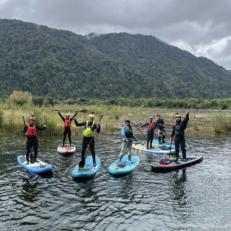 We start the day at 9:30 AM with a warm welcome and professional gear fitting. Then, your certified guide introduces safety basics and essential SUP techniques. Right after, the adventure begins. You will navigate calm and playful waters surrounded by evergreen forests, basaltic canyon walls, and the stunning presence of Yates Volcano in the distance. Because of these impressive landscapes, this SUP river adventure Chile is one of the most iconic water experiences in Patagonia.